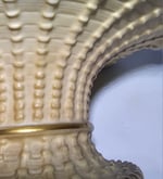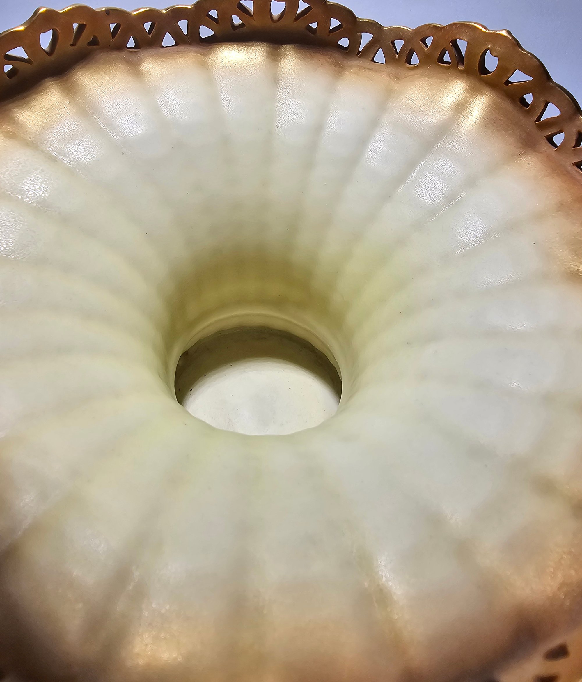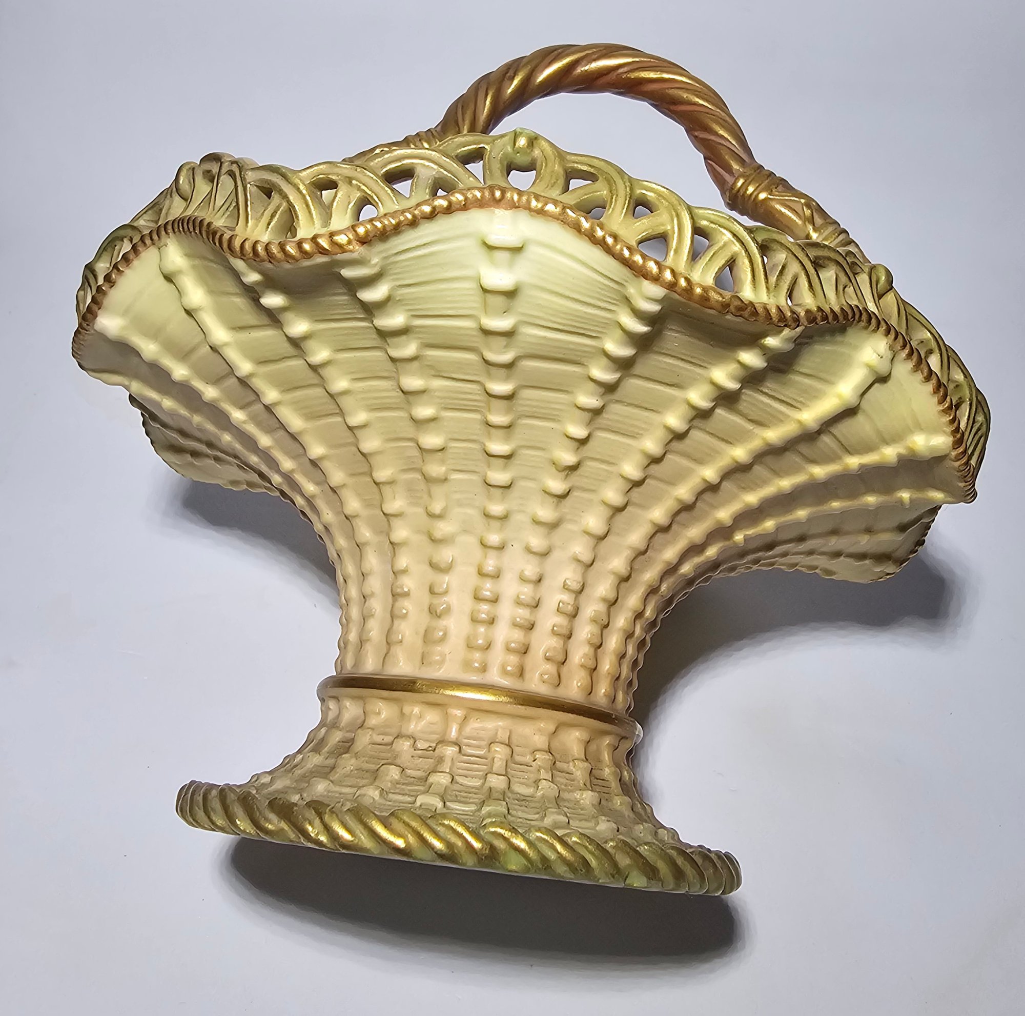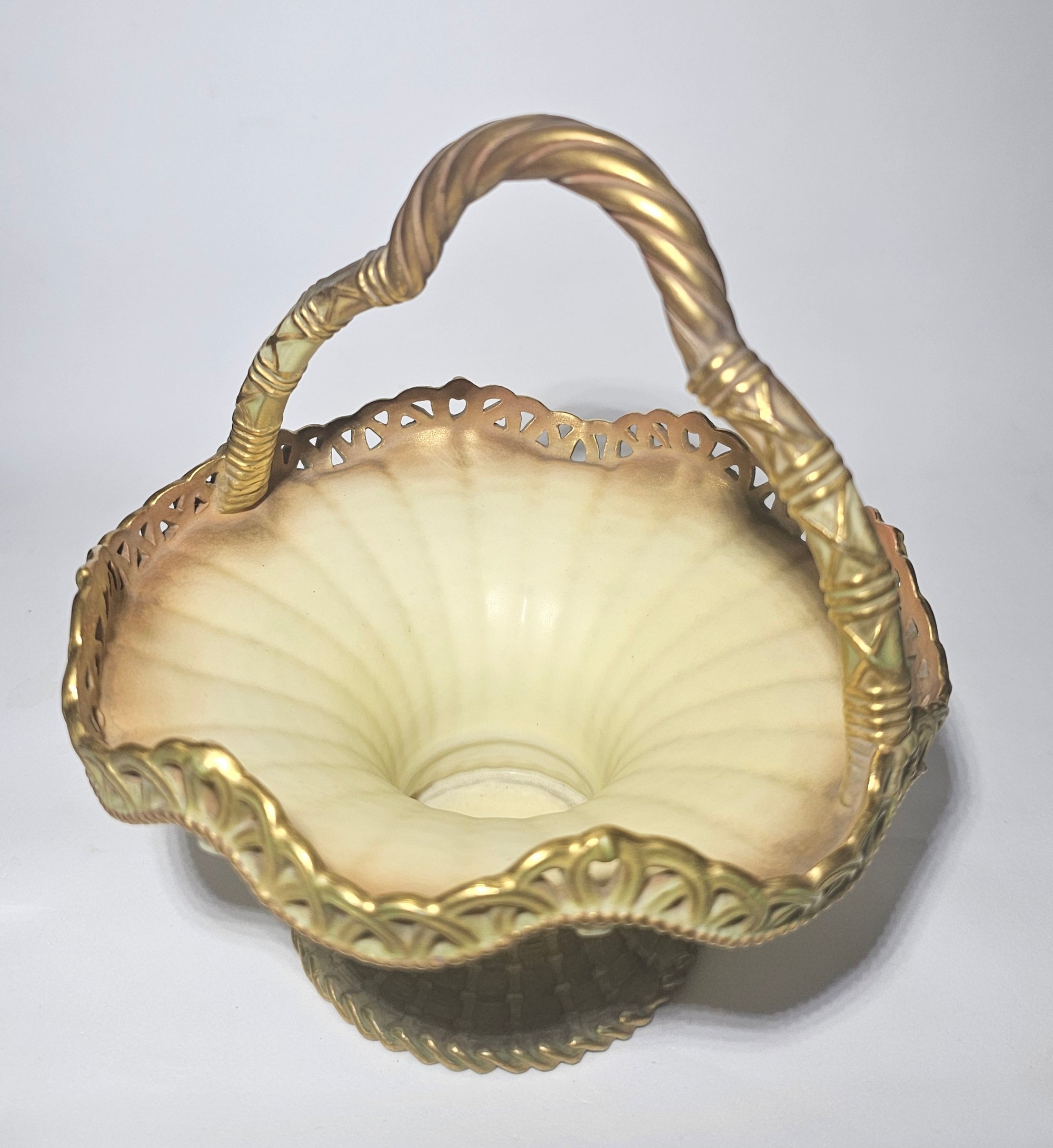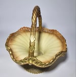 A round lobed basket with a handle above. Designed to appear as a wicker work or reeded basket with a bound handle. In blush ivory ground with a gilded finish. The rim of the basket being reticulated following the lobed shape has a greener ground above rope like edging. The inside of the basket flows downwards to a central well deep enough to hold a floral arrangement.