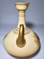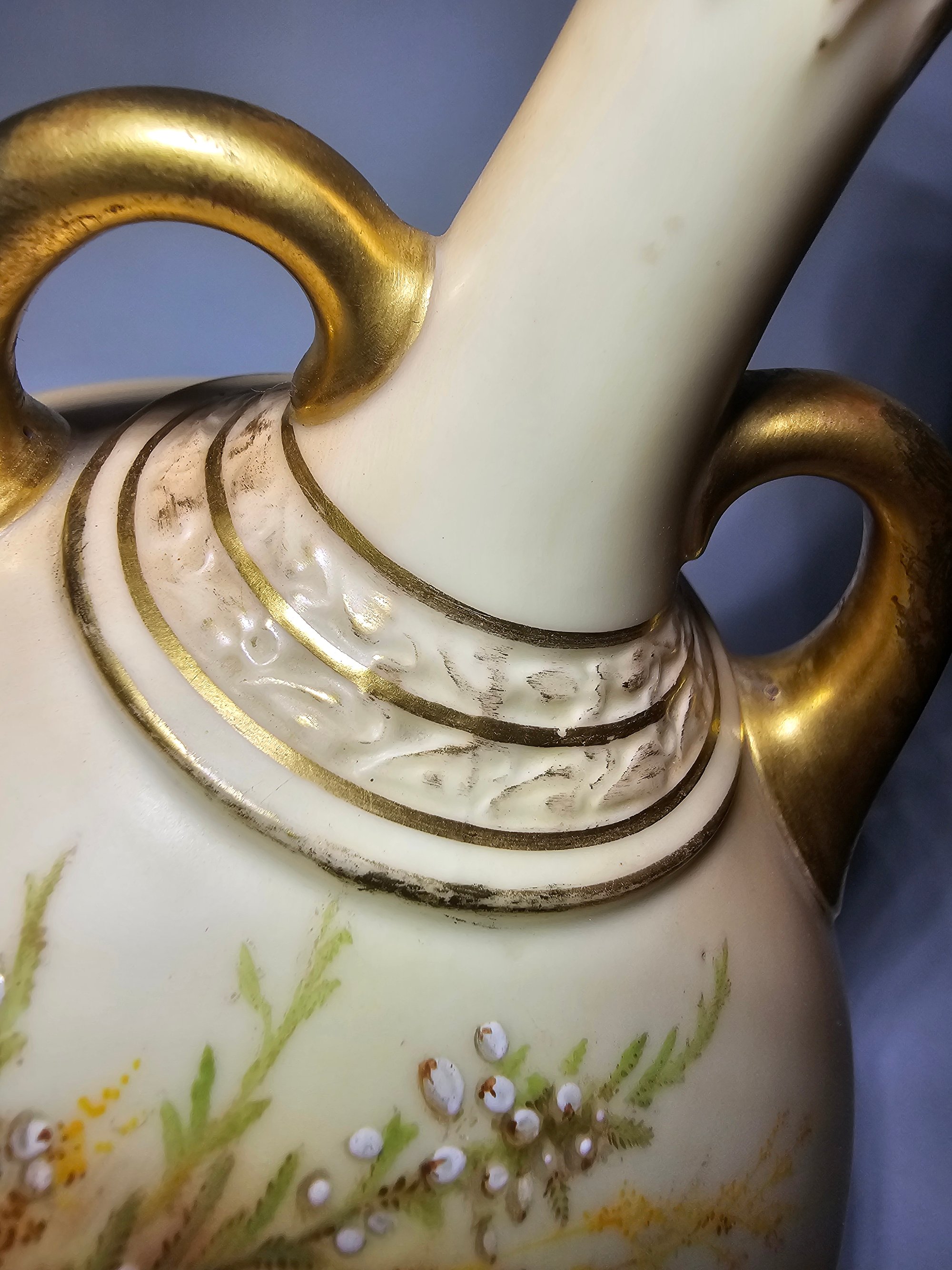 This vase is of a compressed bulbous design with a long neck rising from a raised collar with raised decoration and with a flared end. Gilded handles connecting neck to body. Uncommonly decorated with sprays of heather on a blush ivory ground. Gilt banding and highlights throughout.