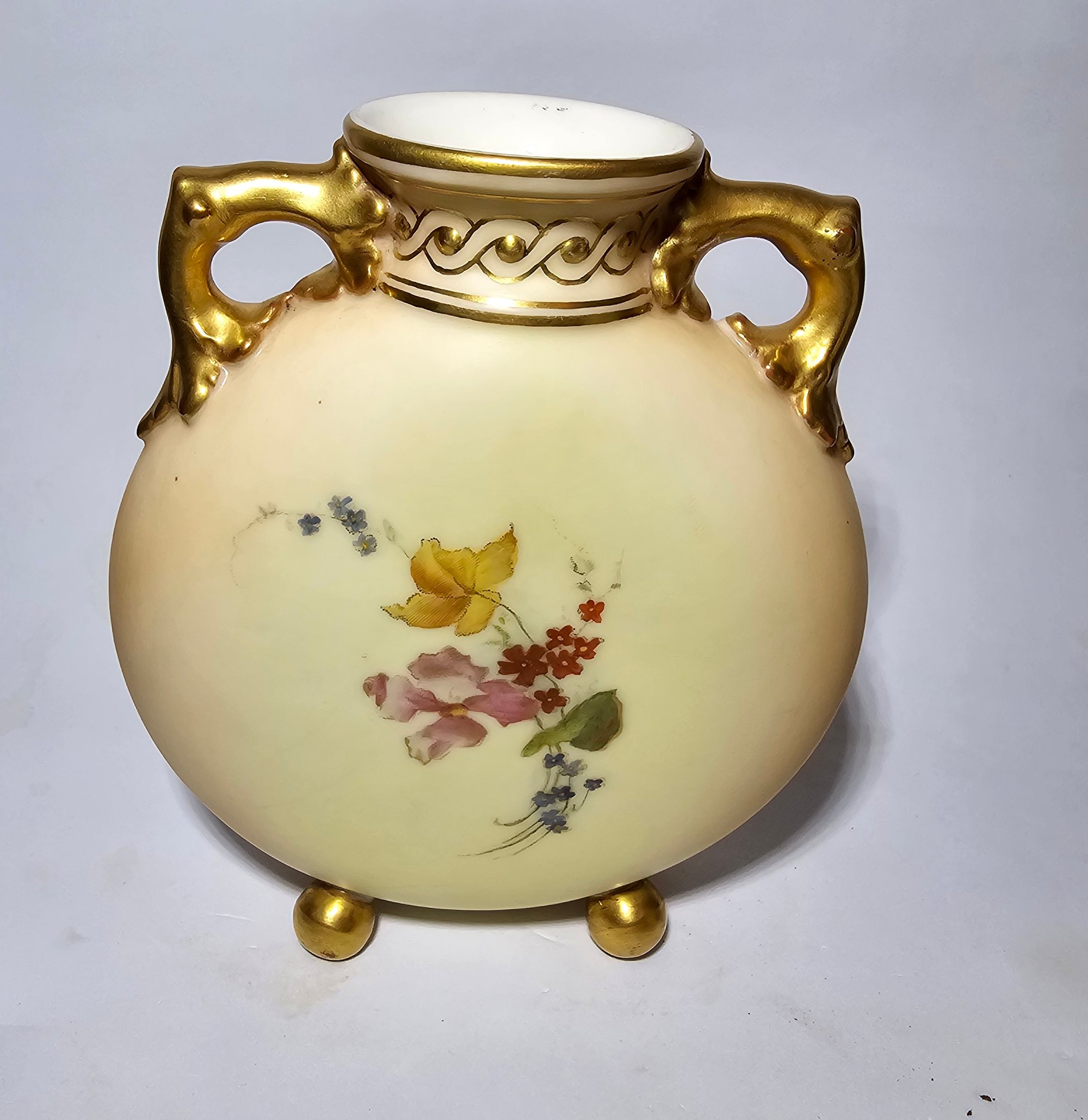 Two ‘Moon’ or ‘Pilgrim’ Flasks decorated with floral sprigs upon a blush ivory ground. Whilst decoratively not a true pair they complement each other being similarly decorated and with similar coloured glazes used. Gilt handles rise from the round body and attach to the raised neck. The neck has a twisted rope-like decoration with gilt highlights. All standing on gilded ball feet.